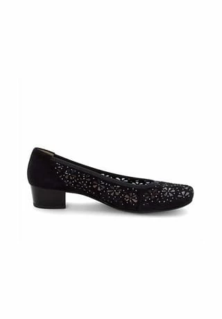 Flotter Pumps von Ara aus einem feinen hochwertigem Nubukleder. Innen ist der Schuh mit einem cromfrei gegerbtem Leder ausgestattet. Der Schuh hat eine normale Weite. Der stabile Blockabsatz hat eine Höhe von cirka 4 cm. Die Laufsohle ist aus Krepp. Die Schuhgröße fällt regulär aus.