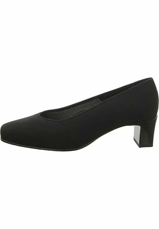 Flotter Pumps von Ara aus einem hochwertigem Synthetikmaterial. Innen ist der Schuh mit einem cromfrei gegerbtem Leder ausgestattet. Der Schuh hat eine normale Weite. Der Trotteurabsatz hat eine Höhe von cirka 4 cm. Die Laufsohle ist aus Gummi. Die Schuhgröße fällt regulär aus.