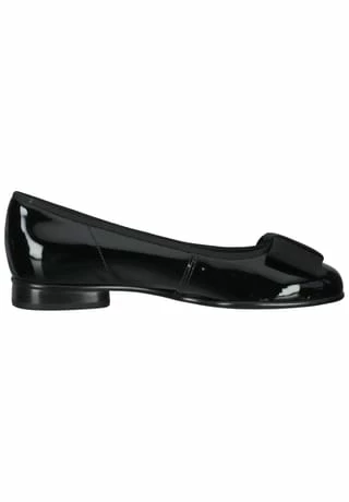 Geschmackvoll und bequem so präsentiert sich dieser tolle Ballerina von Gabor. Hergestellt aus Lackleder und Textil sind die Damenschuhe optisch besonders ansprechend und vielfältig einsetzbar. Um müden Füßen vorzubeugen, besteht die Innenausstattung aus Textil. So ist rund um die Uhr für ein angenehmes Tragegefühl gesorgt. Nochmals erhöht wird der Tragekomfort durch die Decksohle aus Leder, die mit ihrem atmungsaktiven Material für ein optimales Klima im Inneren sorgt. Eine angebrachte Schleife macht die femininen Schuhe zu einem echten Hingucker und rundet das Gesamtbild gekonnt ab. Die strapazierfähige Laufsohle aus Synthetik sorgt für ein gutes Gefühl beim Laufen, während Frauen mit dem modischen Blockabsatz ihre Beine wunderbar betonen können. Für einen cleanen Look kann der Schlüpfschuh einfach mit einer Skinny-Jeans und einem leichten Pullover kombiniert werden. Die Kombination aus Design und Komfort macht den Ballerina von Gabor zu einem unverzichtbaren Begleiter, den man schnell nicht mehr missen möchte.