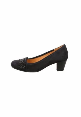 Flotter Pumps von Gabor aus einem feinen hochwertigem Veloursleder. Innen ist der Schuh mit einem cromfrei gegerbtem Leder ausgestattet. Der Schuh hat eine normale Weite. Der Trichterabsatz hat eine Höhe von cirka 5 cm. Die weiche PU-Sohle schont die Gelenke und federt jeden Ihrer Tritte optimal ab. Die Schuhgröße fällt regulär aus.